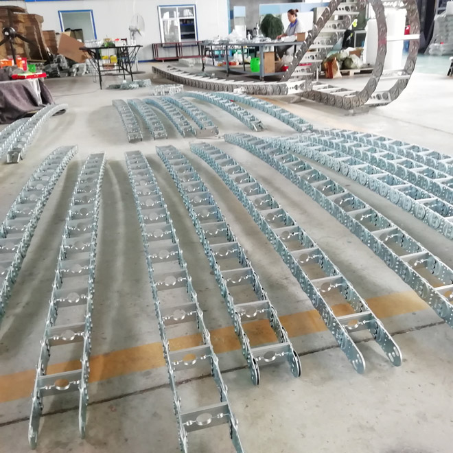 鋼制拖鏈分TL型和TLG型,材質為碳鋼側板和鋁合金隔板組裝而成,主要用于重型,大型機械設備管線的保護。